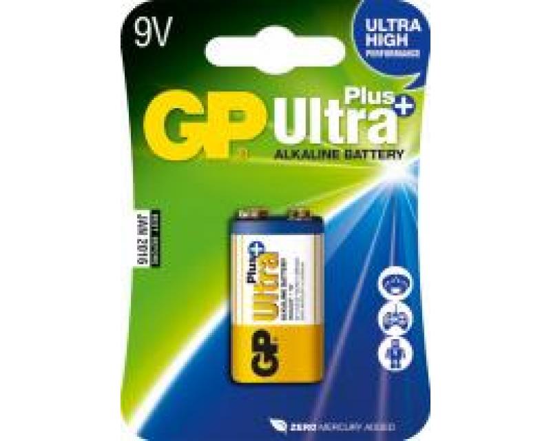Manufacturer: GP Batteries, primary battery, alkaline, voltage: 9V, part number: 1604AUP-U1, size: E-Block, 6LR61, blistered