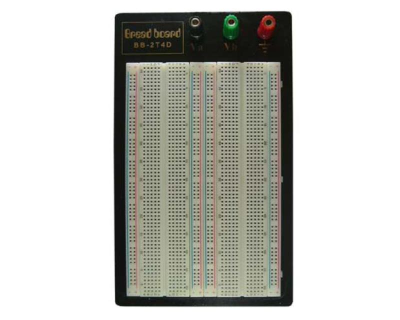 3 farbige Schraubklemmen mit 4mm Aufnahme für Laborstecker, bestehend aus 2 Stk Exp-Boards 830 Kontakte auf stabiler Metallplatte, Lieferung inkl. 4 selbstklebender Gummifüße, universale Verwendung, schnelle Testaufbauten von Schaltungen, reduziert Entwicklungskosten, Reihen in 5er-Schritten durchnummeriert, Spalten von A bis J gekennzeichnet, insgesamt 63 Reihen und 20 Spalten,zusätzlich 4 x 2 Spalten a 50 Reihen zur Spanungszuführung Kenndaten Gesamtkontakte 1660 Spalten 20 Reihen 63, Spalten (Versorgung) 8, Reihen (Versorgung) 50, Rastermaß (RM) 2,54mm, Maße ( LxBxH) 215 x 130 x 30mm (o. Füße)
