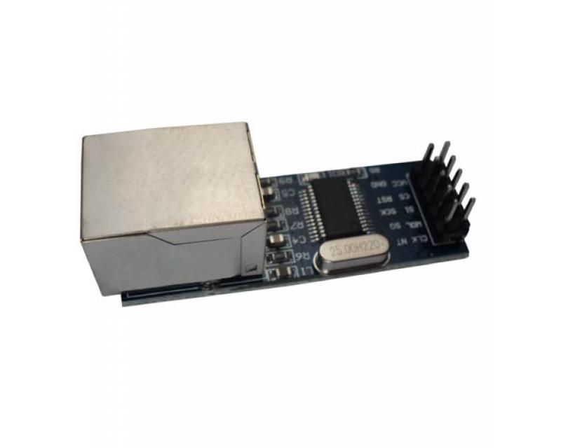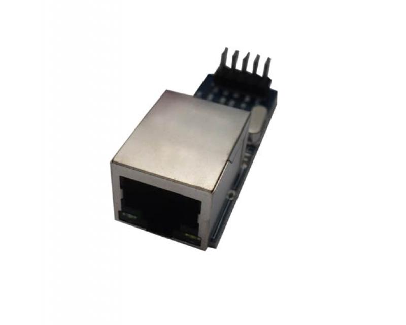 ENC28J60-I/SS mit empfohlener Herstellerbeschaltung, Übertrager RJ45 8p8c für 10/100Base Anwendungen, Pinanschluss: CLK, WOL, SI, CS, VCC, NT, SO, SCK, RSR, GND, Ansteurung per SPI über Microcontroller oder fertige Boards wie Arduino oder vergleichbare