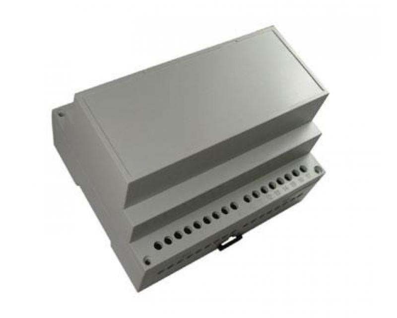 aufhebeln universal housing for mounting on DIN rails, for easy practical snap lock or similar means of a screwdriver, 12 numbered openings in the grid 5:08 for tool feed, lateral openings 12 for respective line Increase / decrease., top and bottom housing together by detents connected additional Fortification 1 by screw (included), internal openings in top and bottom for receiving screws. $$ characteristics dimensions ........................ ........................ 105x71x90 mmFarbe ........................ .................................... gray cabinet space ........... ..... 2 TE (sub-units)