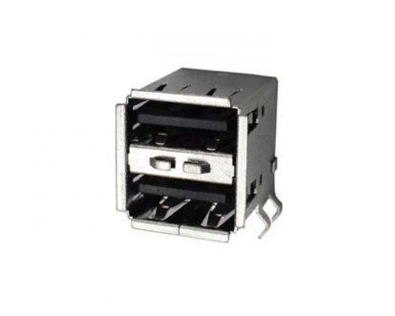 USB socket type A, 2 x krik A, in een huis geschikt voor gebruik met PCB, 90 ° gebogen, afmetingen (met uitzondering pins) (W) 16,1 x 16,1 x 17,0mm fosforbrons, contacten, stroomvoercapaciteit 1A doorslagspanning 1min 1000V AC, Operating temp -55 tot + 105 ° C