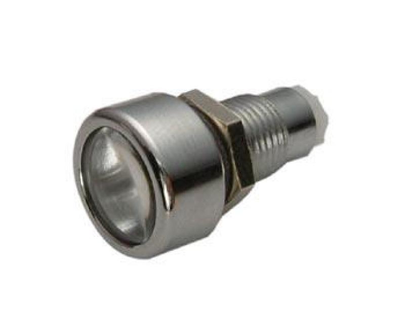 Einbaufassung für 5mm LEDs, Ausführung mit Linse, glanzverchromtes Metallgehäuse für Spritzwassergeschützten Einbau. Einbnbaudurchmesser: 8mm